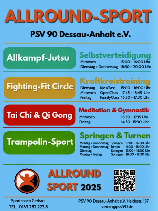Allround Sport im PSV 90 Dessau-Anhalt e.V., bietet eine Vielzahl an Aktivitäten, die Körper und Geist in Einklang bringen. Mit Freude an Kampfsport und Selbstverteidigung, traditioneller Gesundheitsgymnastik durch Meditation in Bewegung, und der unvergleichlichen Leichtigkeit auf dem olympischen Trampolin, fördern wir die allgemeine Fitness unserer Mitglieder. Wir glauben fest daran, dass auch unser Kraftkreistraining der Schlüssel zur Verbesserung der allgemeinen Fitness ist. Besuche uns und erlebe diese Vielfalt!