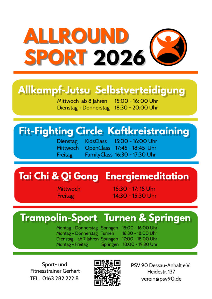 Allround Sport im PSV 90 Dessau-Anhalt e.V., bietet eine Vielzahl an Aktivitäten, die Körper und Geist in Einklang bringen. Mit Freude an Kampfsport und Selbstverteidigung, traditioneller Gesundheitsgymnastik durch Meditation in Bewegung, und der unvergleichlichen Leichtigkeit auf dem olympischen Trampolin, fördern wir die allgemeine Fitness unserer Mitglieder. Wir glauben fest daran, dass auch unser Kraftkreistraining der Schlüssel zur Verbesserung der allgemeinen Fitness ist. Besuche uns und erlebe diese Vielfalt!